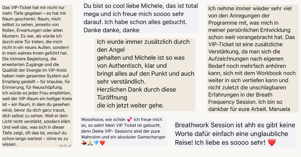 ✨ Du bist nicht mehr allein. Täglicher Zugang zu Michèle und dem Team gibt dir Halt, Präsenz und echte Führung – und plötzlich wird Transformation leicht.